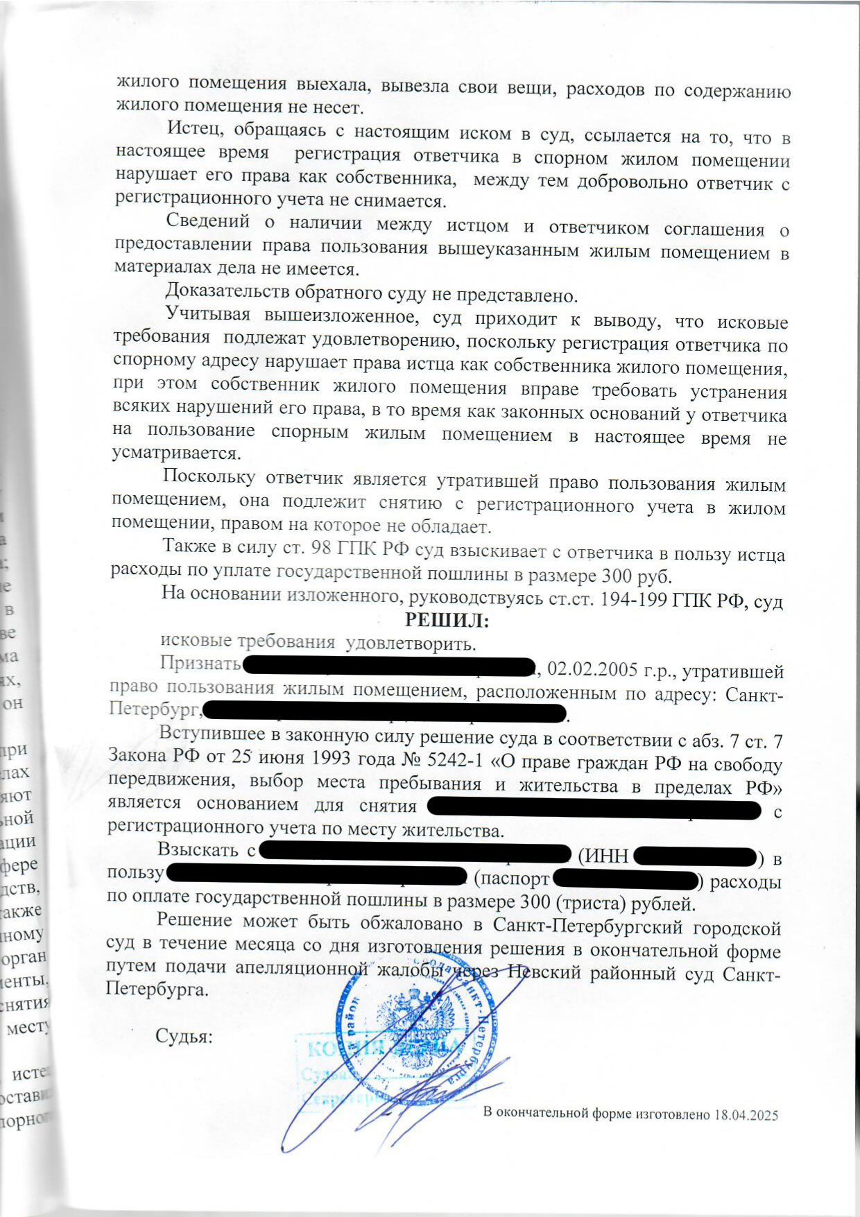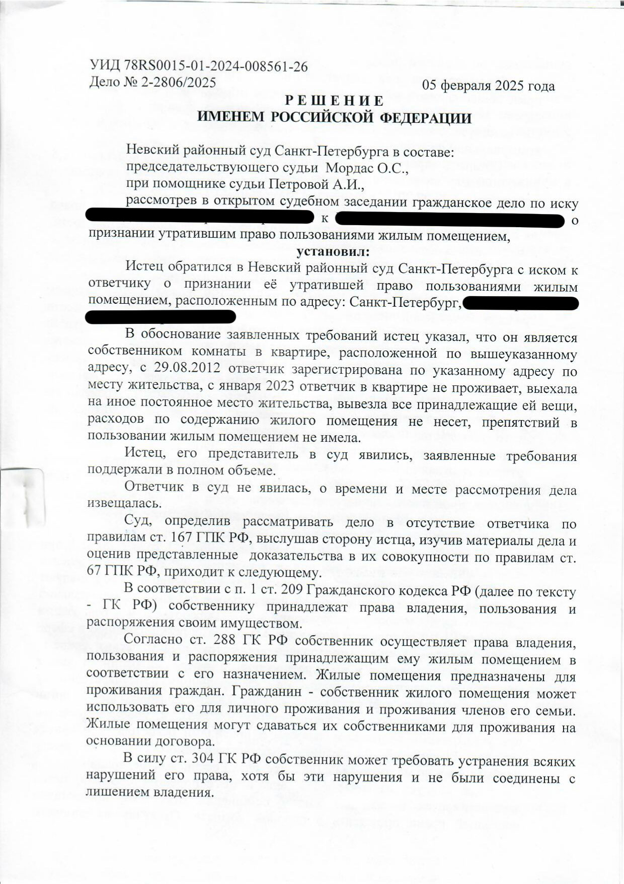 В итоге суд полностью поддержал отца и признал дочь утратившей право пользования комнатой и постановил снять её с регистрации.