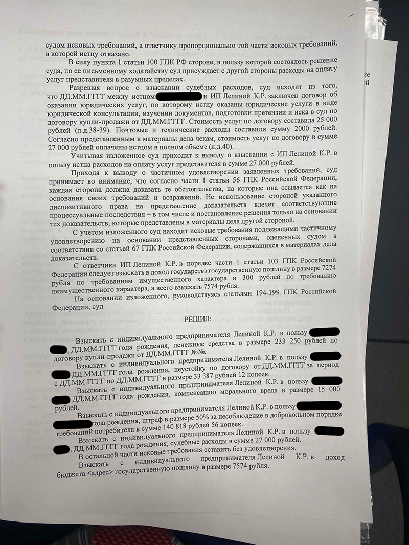 На основании Закона о защите прав потребителей (ст. 32) суд признал договор расторгнутым и обязал ответчика вернуть уплаченную сумму — 233 250 рублей, а также неустойку 33 387,12 рублей за просрочку.