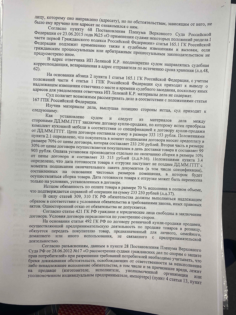 Наша доверительница заказала кухонный гарнитур стоимостью 370 968 рублей, внесла предоплату 233 250 рублей (70% от стоимости договора), а также подписала соглашение об установке гарнитура. Срок изготовления был чётко указан в договоре, но мебель так и не была доставлена покупателю.