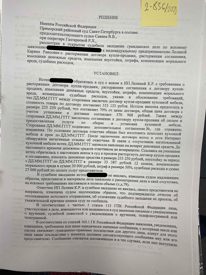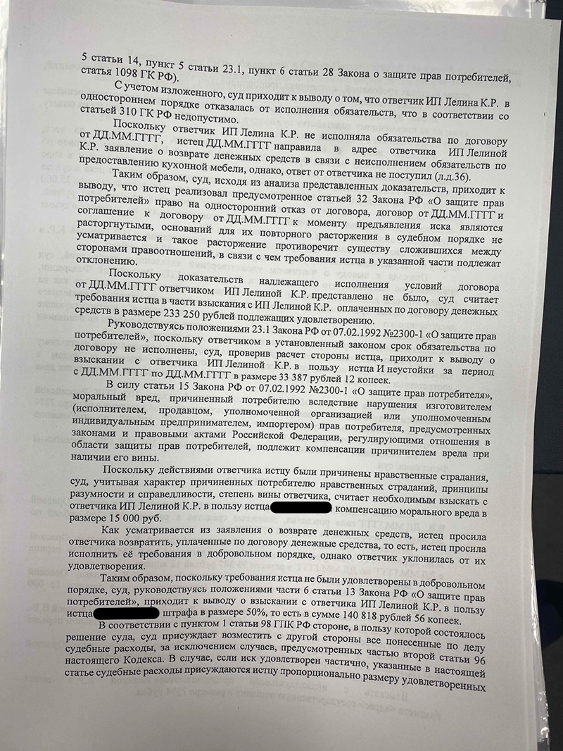 Итог: за отказ выполнить заказ нерадивому предпринимателю придётся заплатить почти 460 000 рублей вместо стоимости самой кухни.