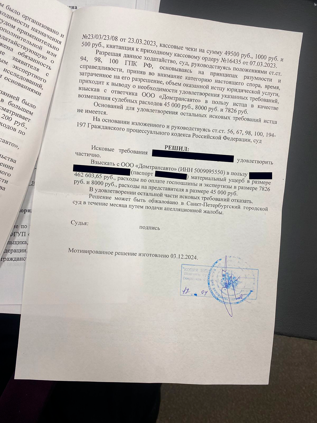 С «Домтрансавто» взыскано более 460 тысяч рублей в счёт разницы между реальным ущербом и тем, что покрыла страховка.