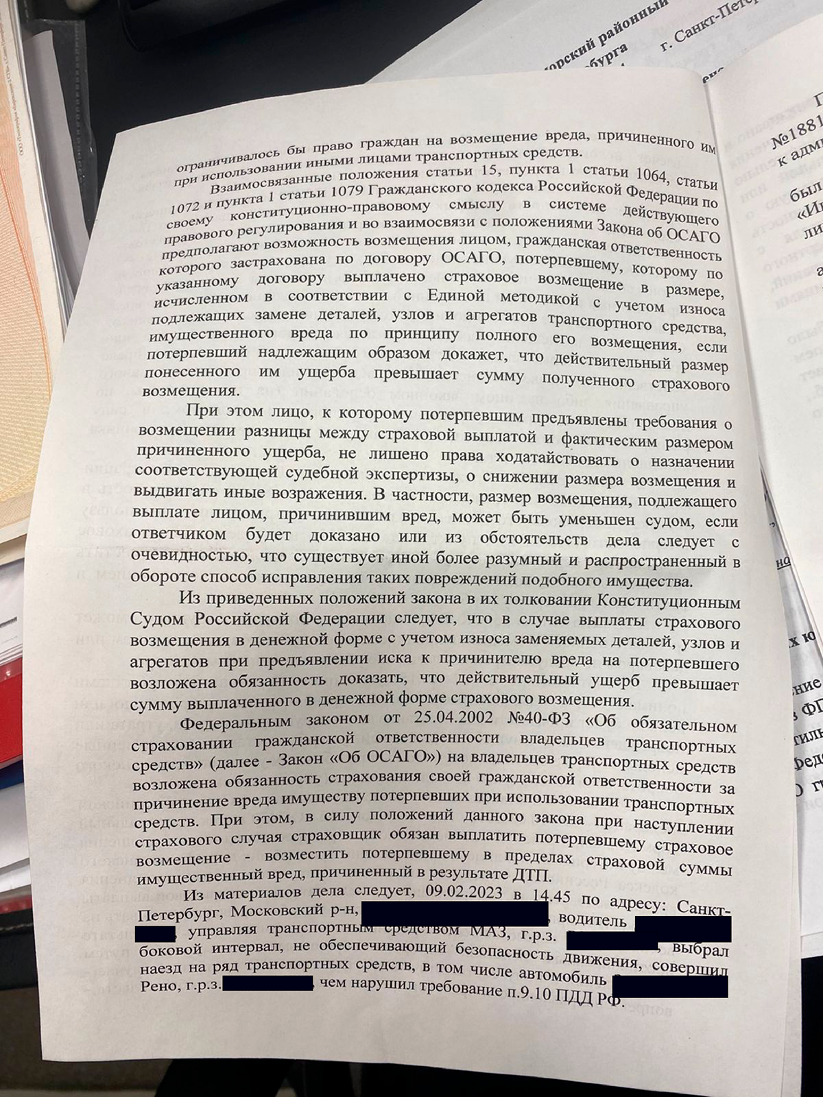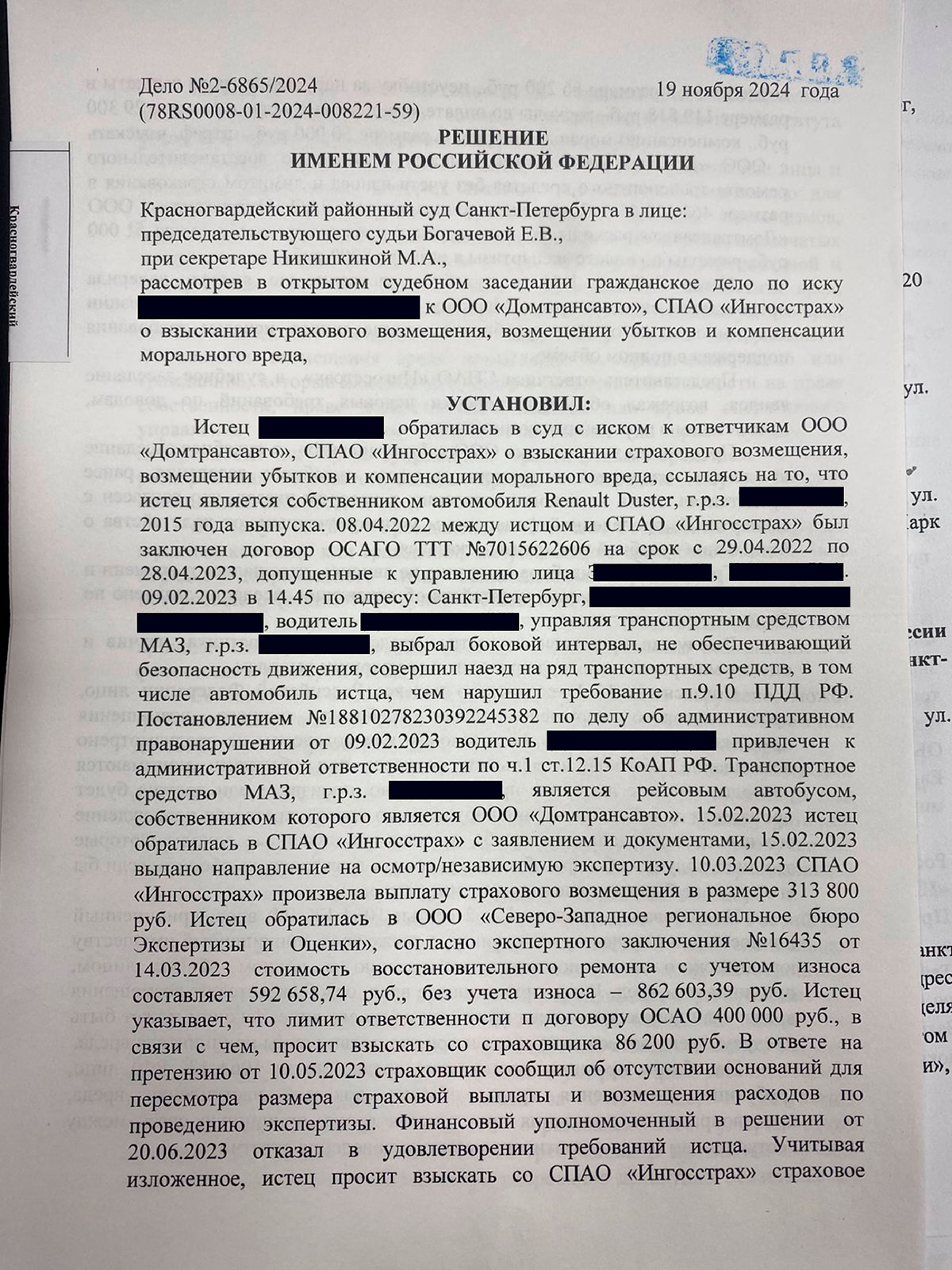 Водитель рейсового МАЗа зацепил Renault Duster нашего доверителя на проспекте Гагарина в Петербурге. Страховщик выплатил 313 800 рублей по ОСАГО, но экспертиза показала: ремонт стоит куда больше — до 862 000 без учёта износа.