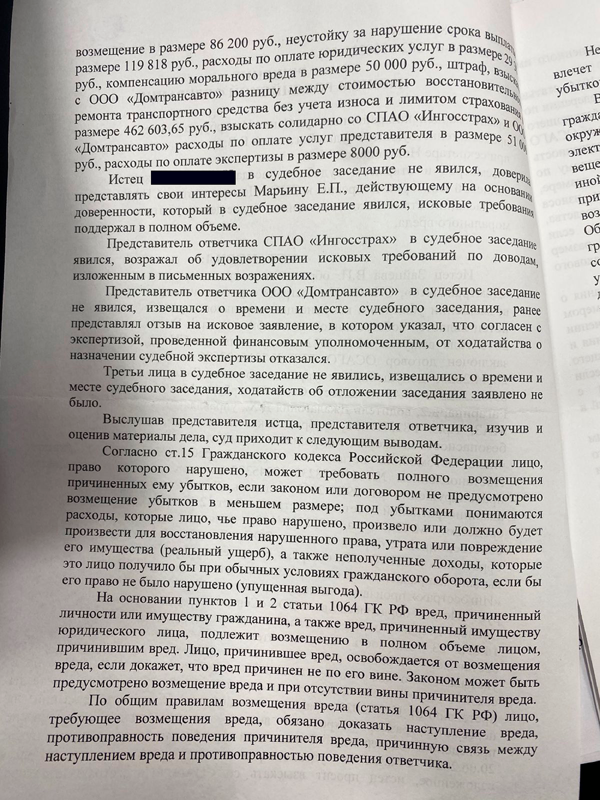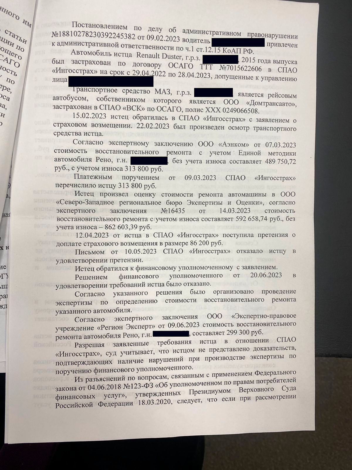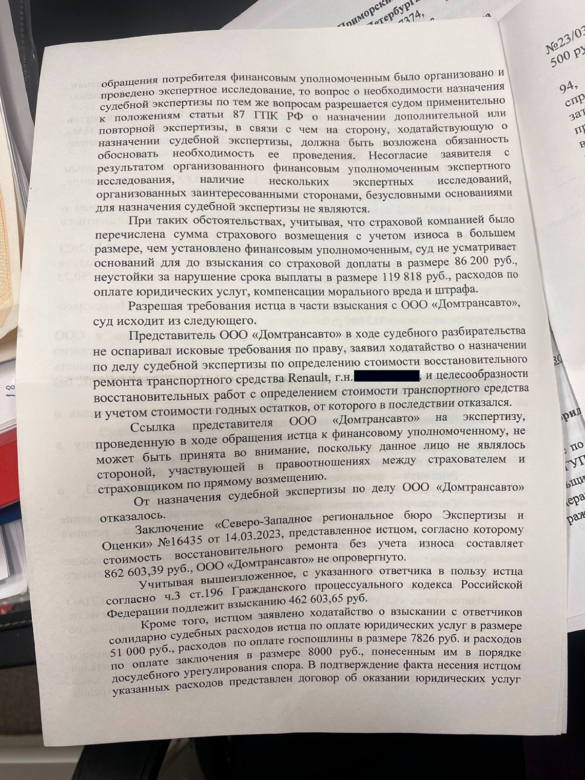 Сторона истца потребовала доплату 86 200 рублей, неустойку, юруслуги и моральный вред. Финансовый уполномоченный отказал. Страховая стояла на своём: «Мы даже переплатили — экспертиза показала ущерб меньше, чем выплатили».