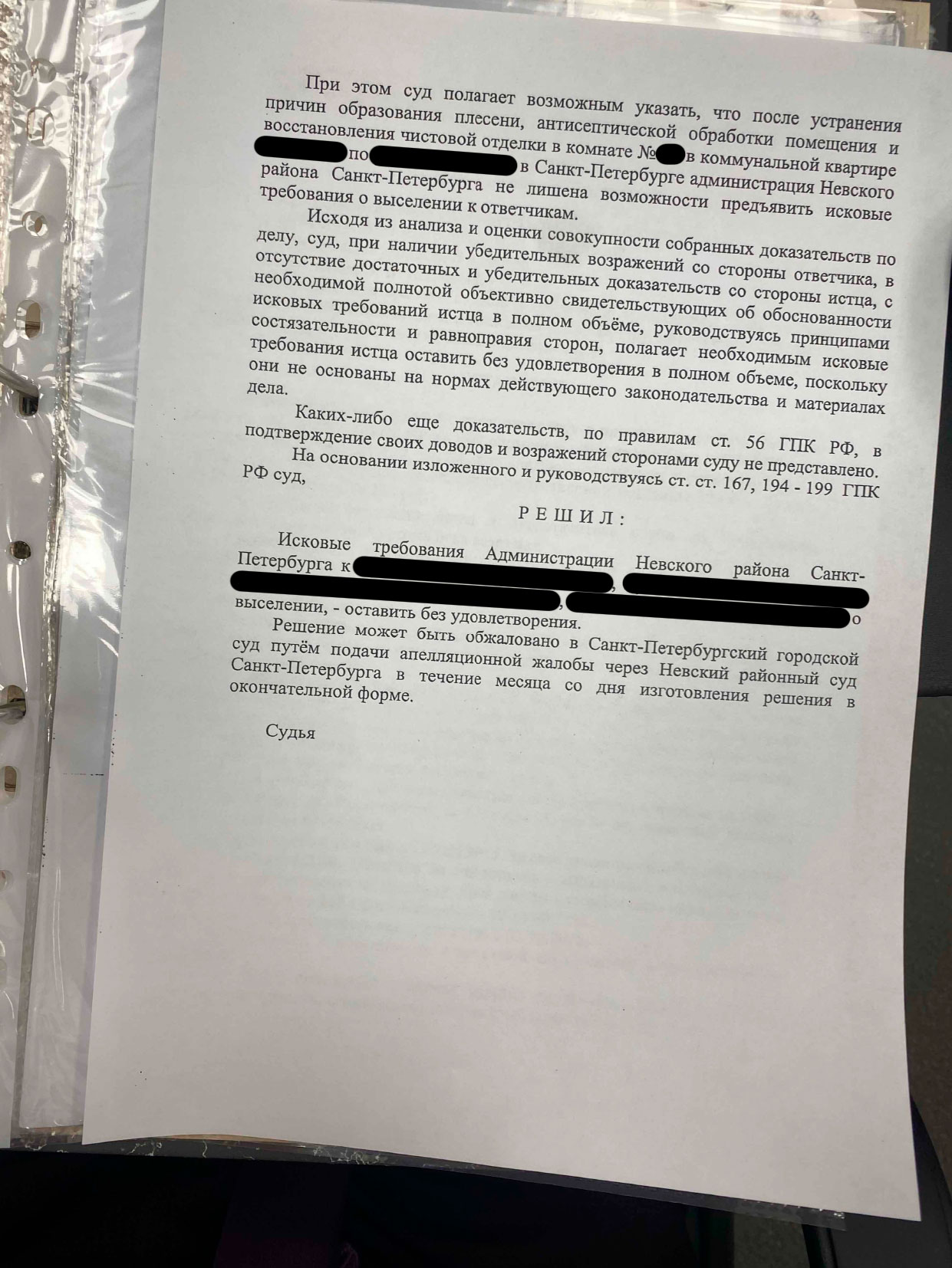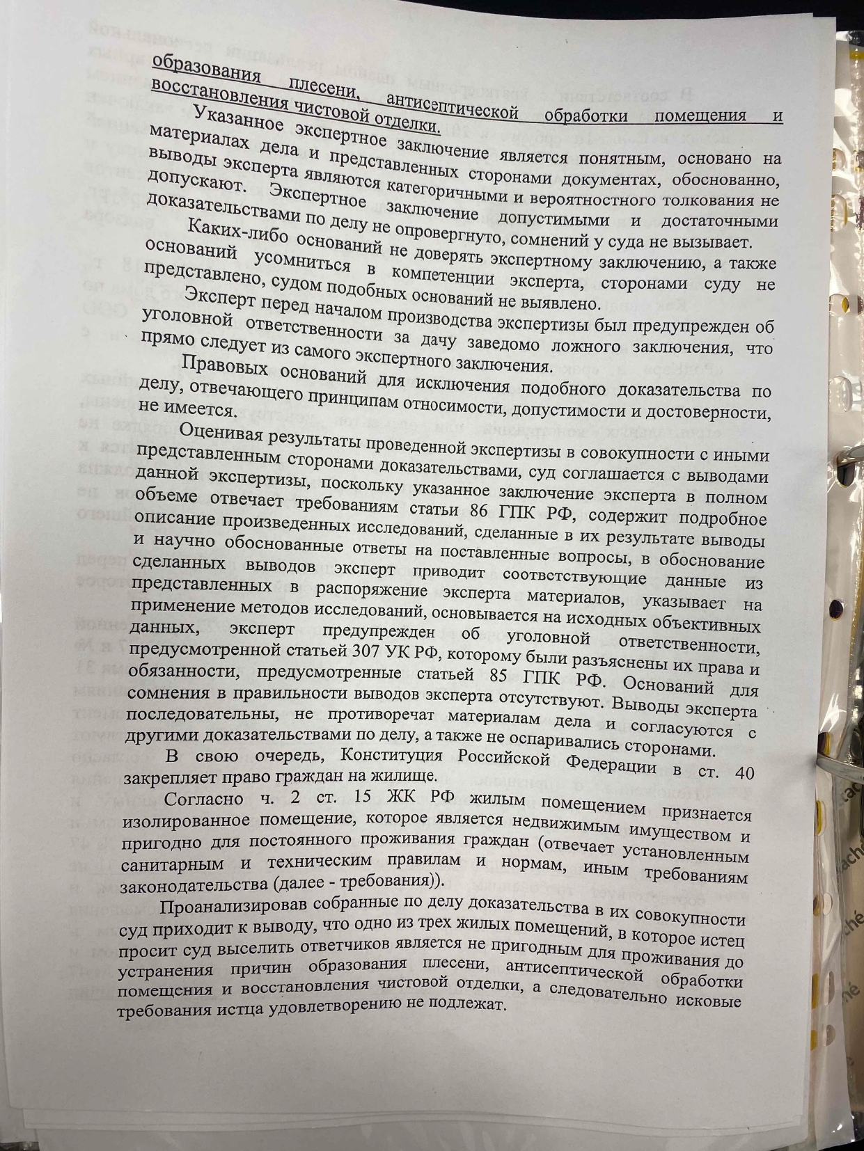 В экспертизе было указано: одна из комнат, в которую предполагалось выселение, действительно не соответствует требованиям к жилым помещениям, т.е. до устранения плесени и восстановления отделки — жить там нельзя.