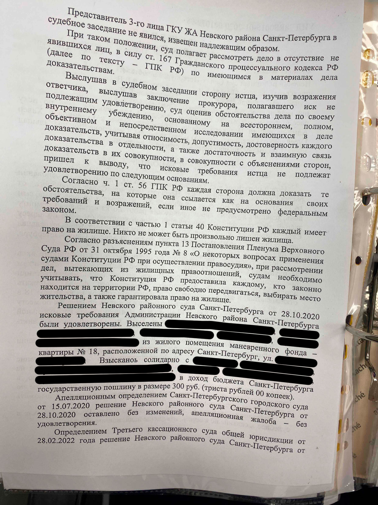 В кассационной инстанции администрация настаивала на том, что судебные акты двух инстанций законные и обоснованные, однако нам удалось добиться того, что в кассации услышали о вопиющем пренебрежении администрацией своих обязанностей по предоставлению пригодного для проживания помещения.