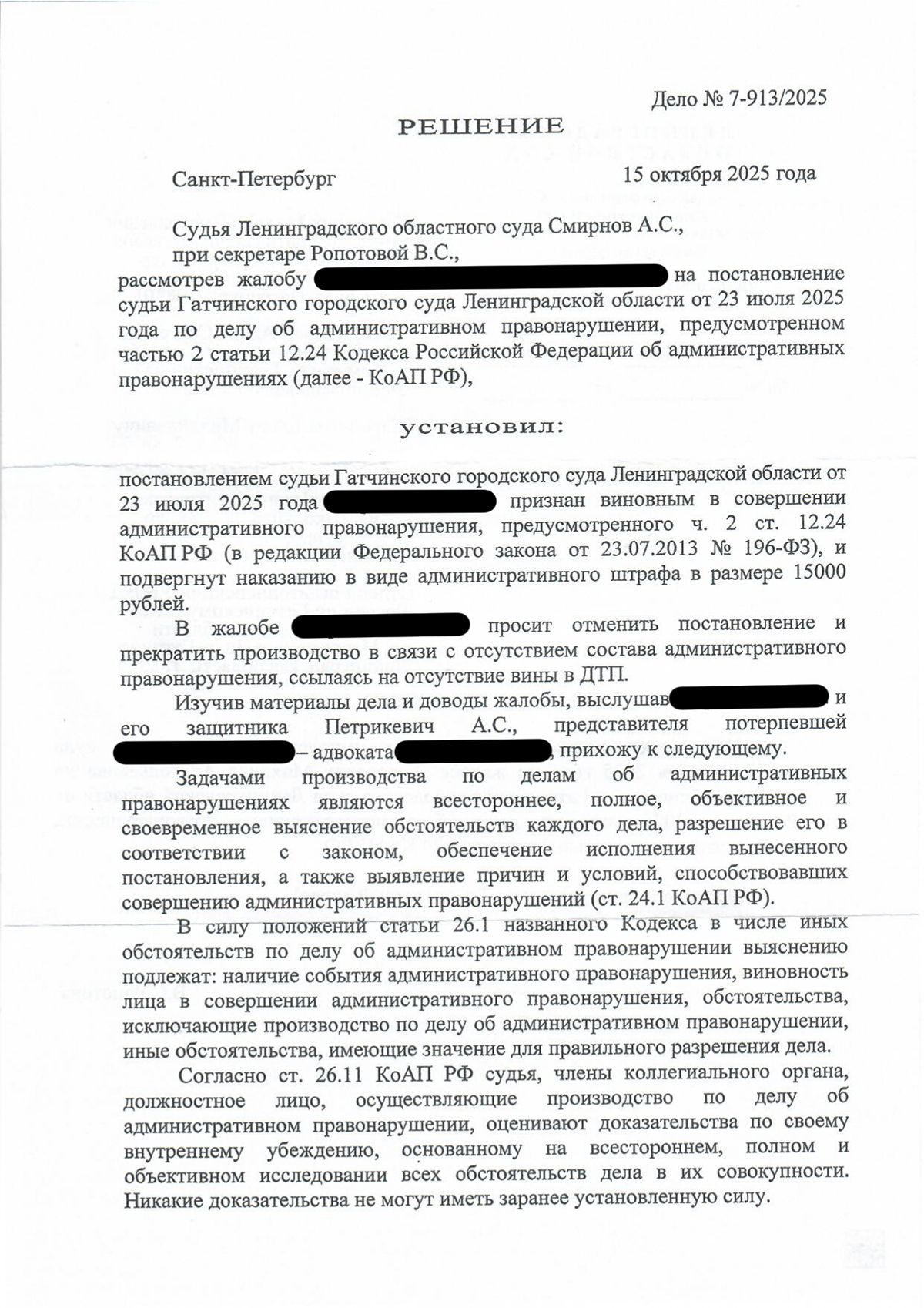 В интересах нашего клиента ЮА «Петербургское Право» обжаловало постановление судьи Гатчинского городского суда от 23 июля 2025 года, которым наш доверитель был признан виновным и назначен административный штраф в размере пятнадцать тысяч рублей. Все процессуальные действия по подготовке и подаче жалобы, сбору доказательств и защите в суде выполнены нами.