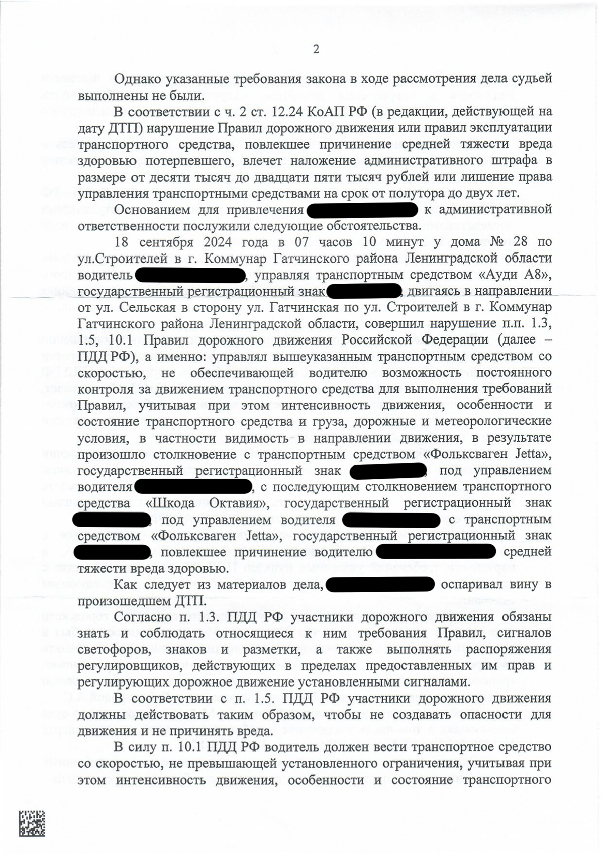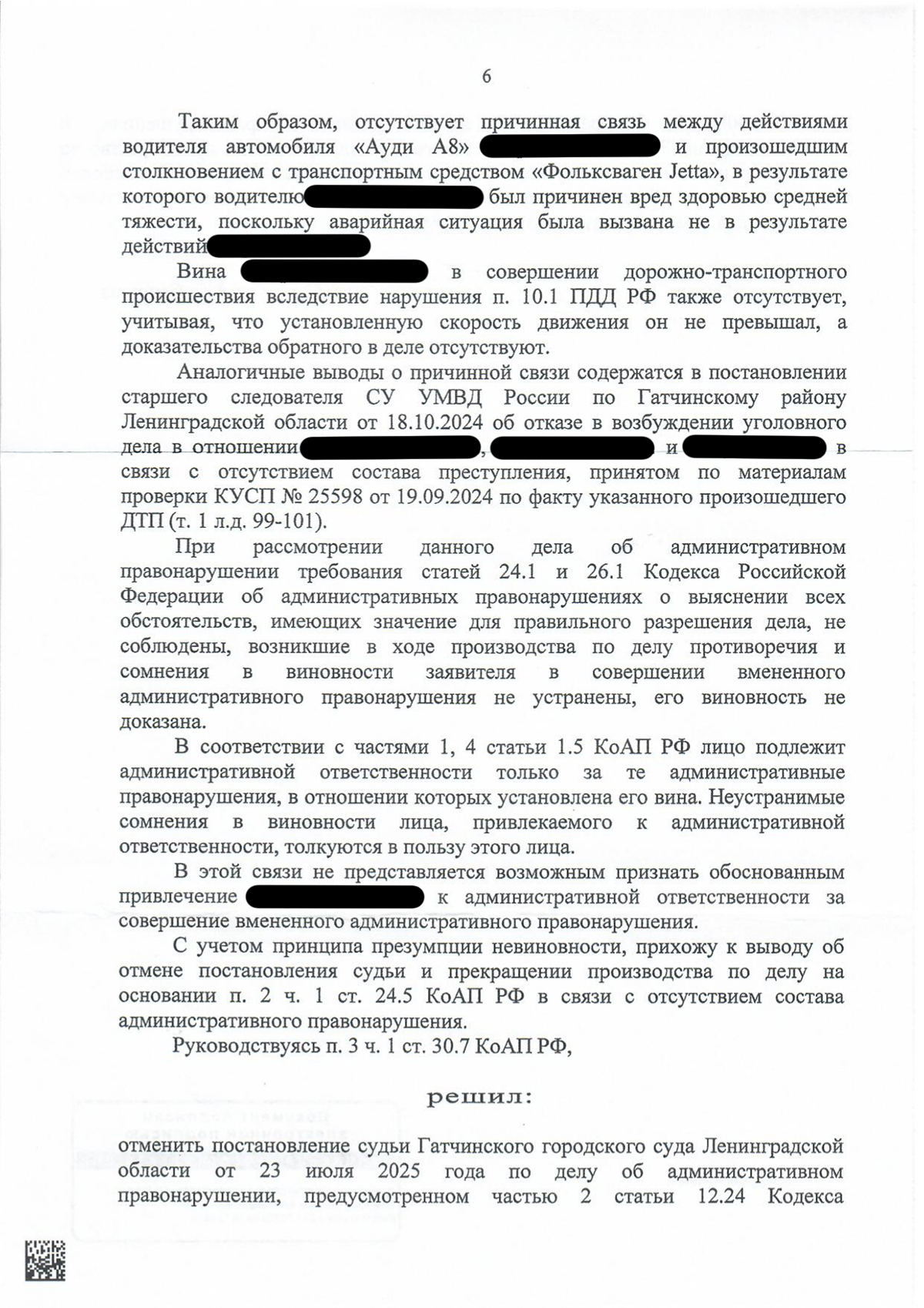 Дело связано с ДТП, произошедшим 18 сентября 2024 года: наш клиент на «Ауди А8» столкнулся с выезжавшим с прилегающей территории автомобилем, в результате чего одна из участниц получила вред средней тяжести. Наш клиент оспаривал вину и указывал на отсутствие причинной связи между его действиями и наступившими последствиями.