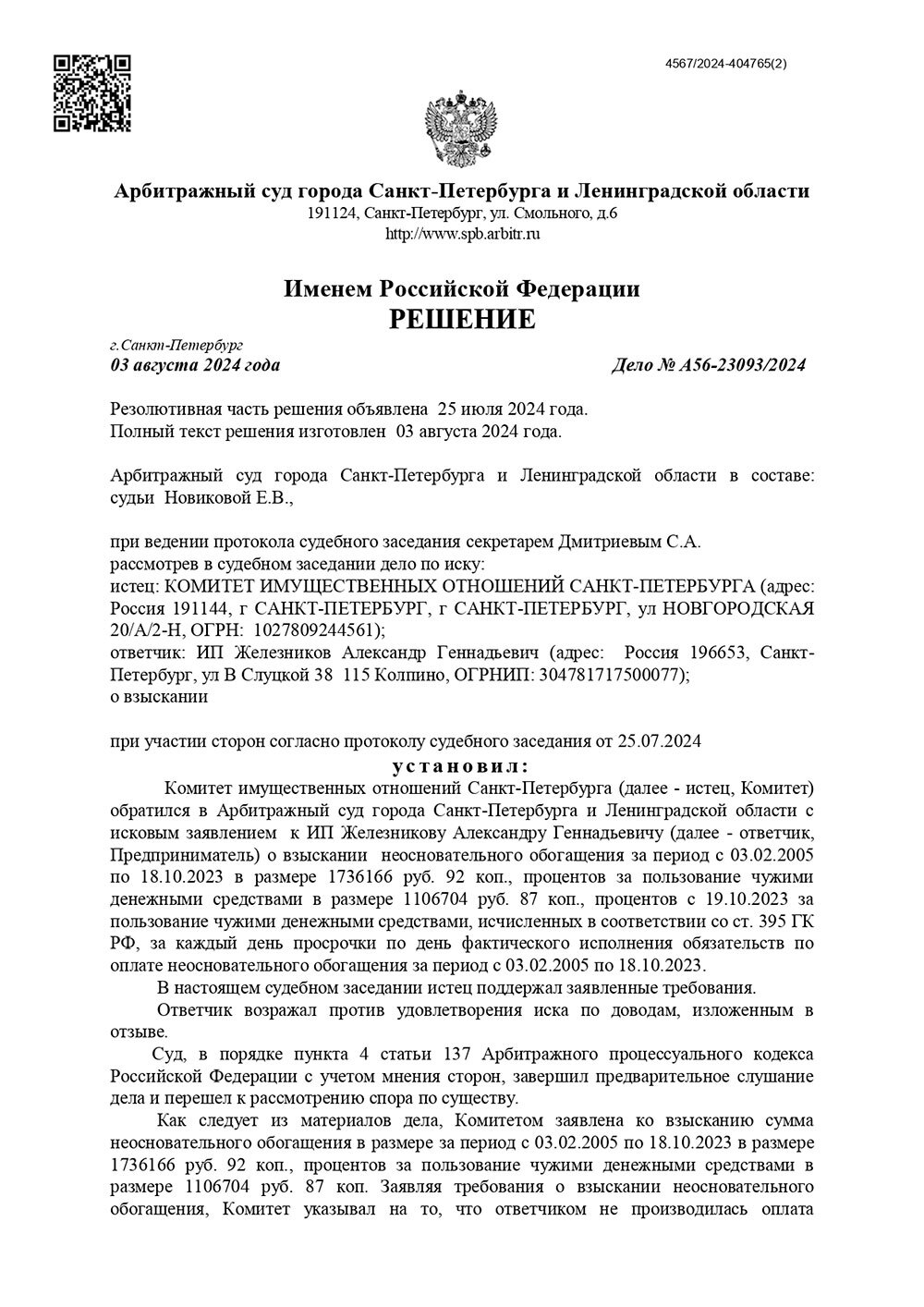 Комитет имущественных отношений Санкт-Петербурга (КИО) посчитал, что предприниматель с 2005 года фактически пользовался частью земельного участка (за вычетом площади под зданием) без правовых оснований и без оплаты. На этом основании КИО предъявил иск о взыскании неосновательного обогащения за период с 03.02.2005 по 18.10.2023 в размере 1 736 166,92 руб., а также процентов за пользование чужими денежными средствами в сумме 1 106 704,87 руб. (на момент подачи иска). Общая сумма требований превышала 2,8 млн рублей.