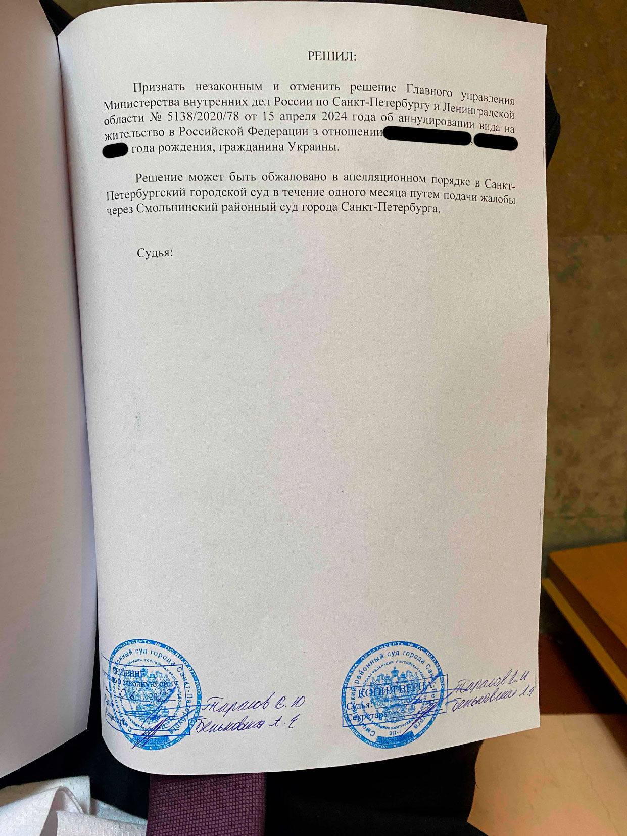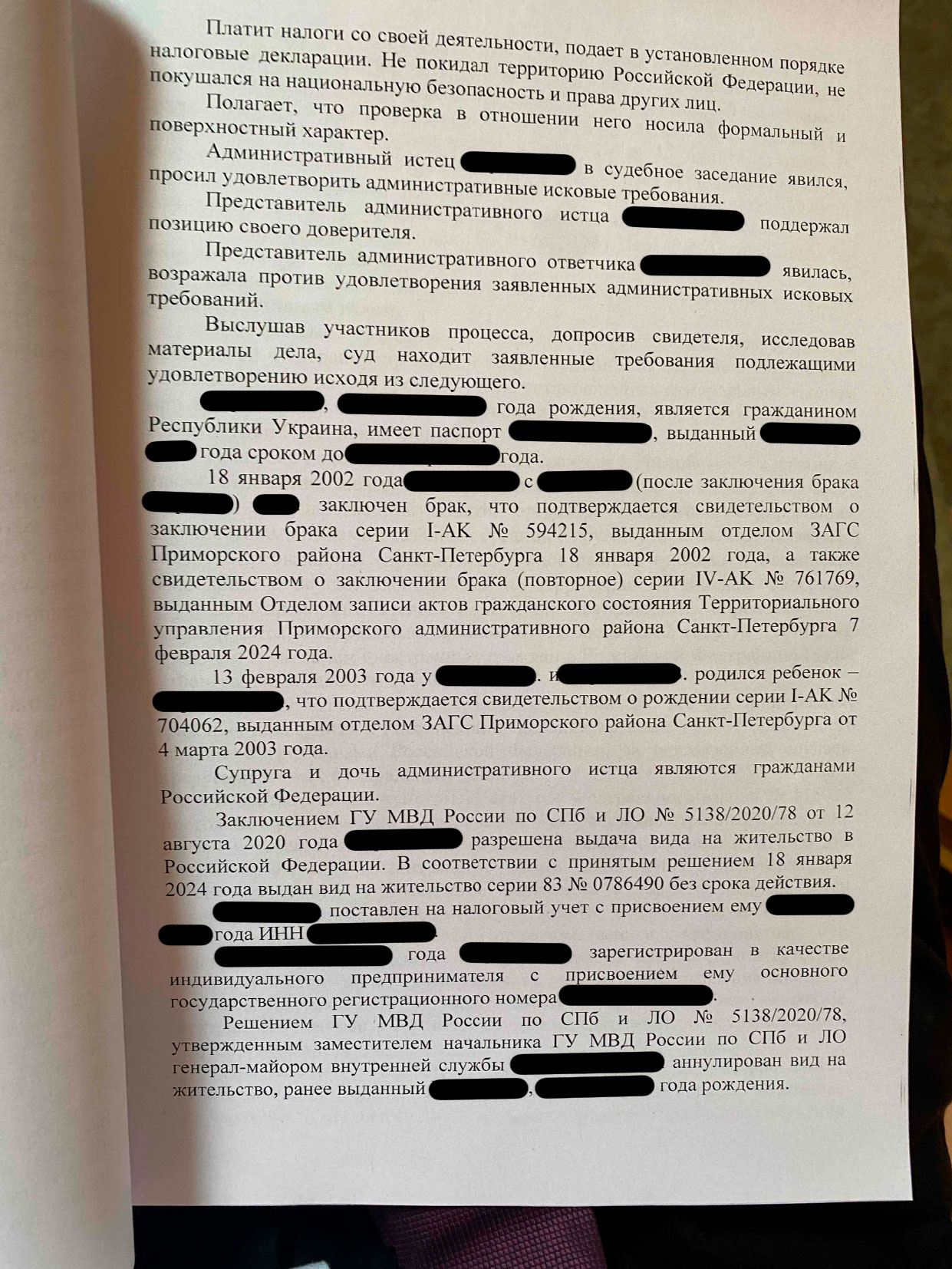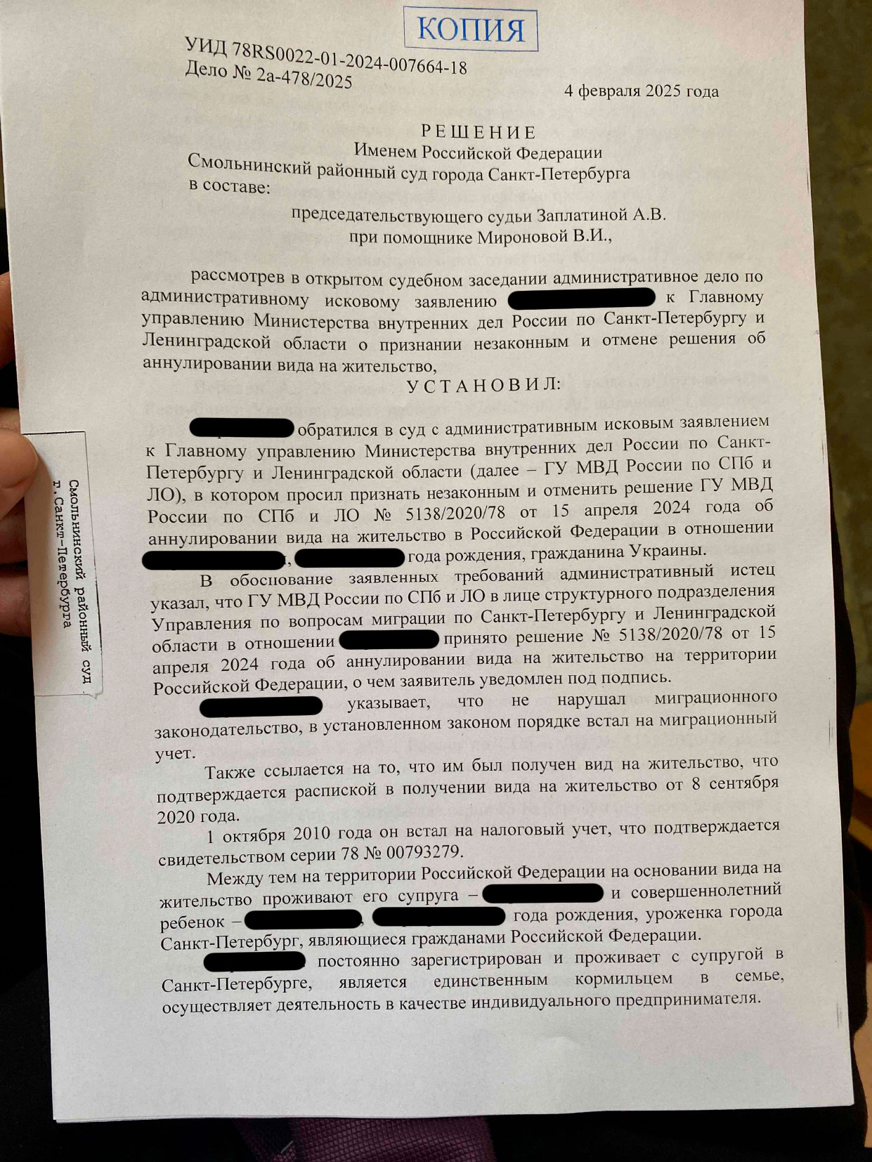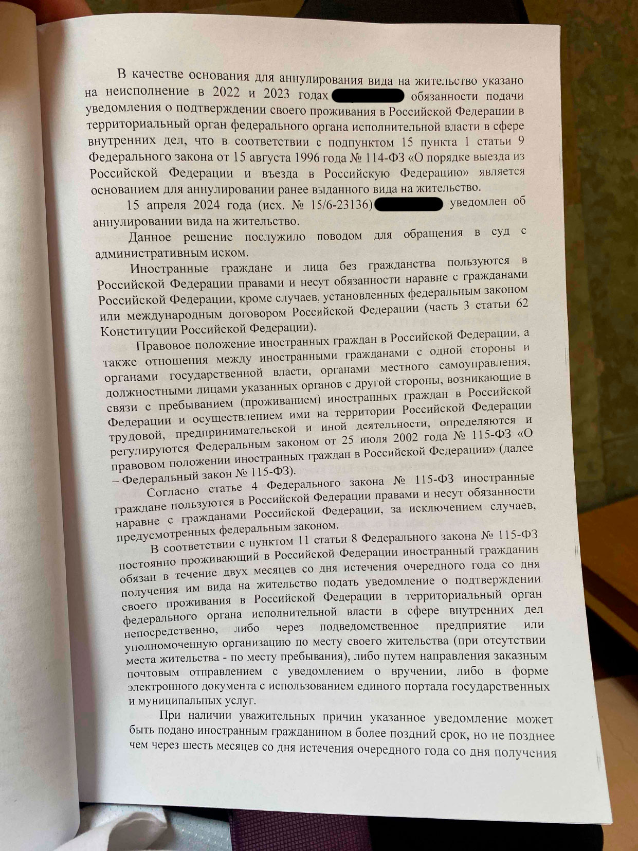 Наш доверитель, иностранный гражданин, живет в Петербурге более 20 лет, женат на гражданке РФ, воспитывает дочь и ведет бизнес. Несмотря на это, МВД аннулировало его вид на жительство за неподачу уведомлений о проживании в 2022–2023 годах (п. 15 ч. 1 ст. 9 закона № 115-ФЗ).