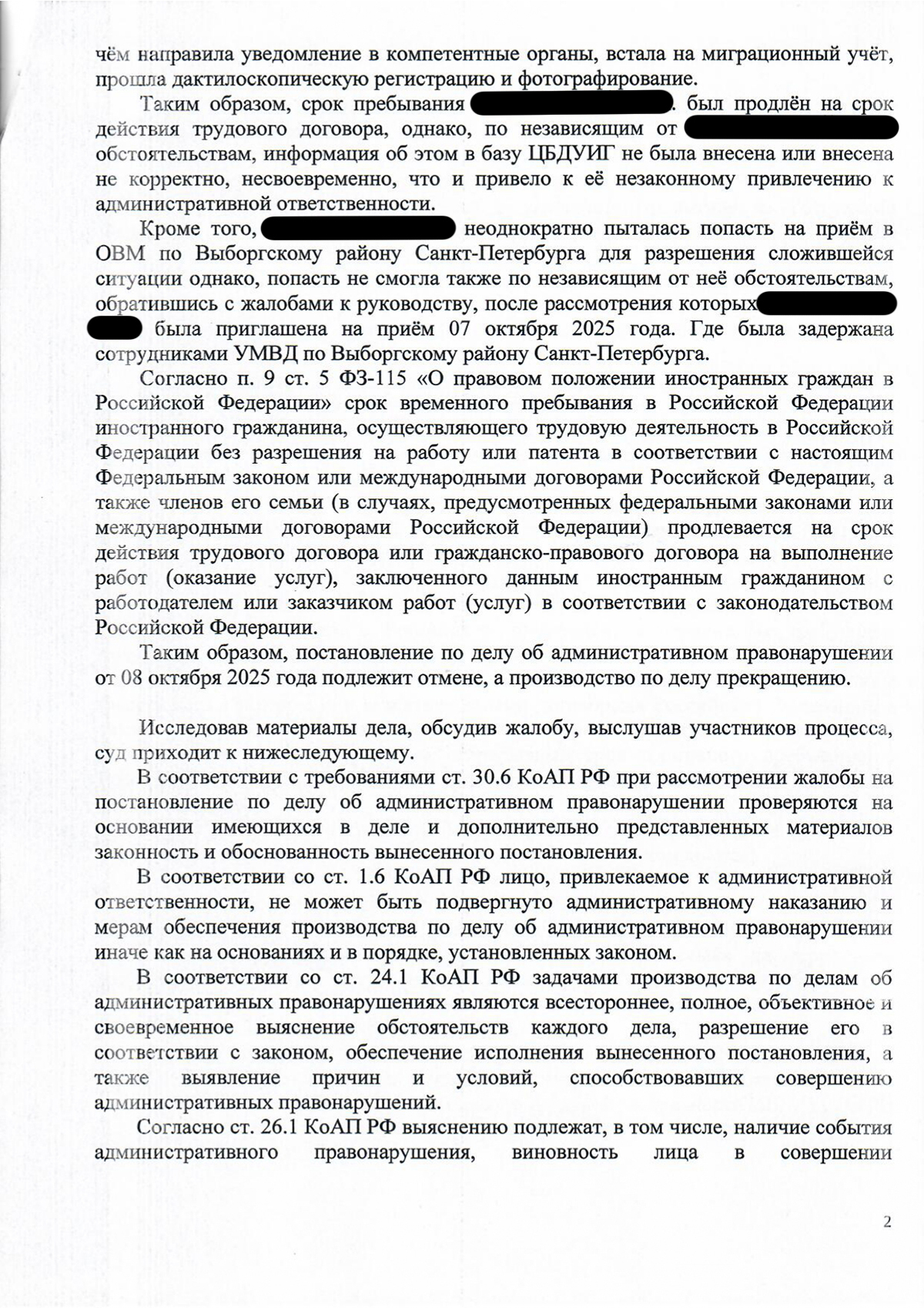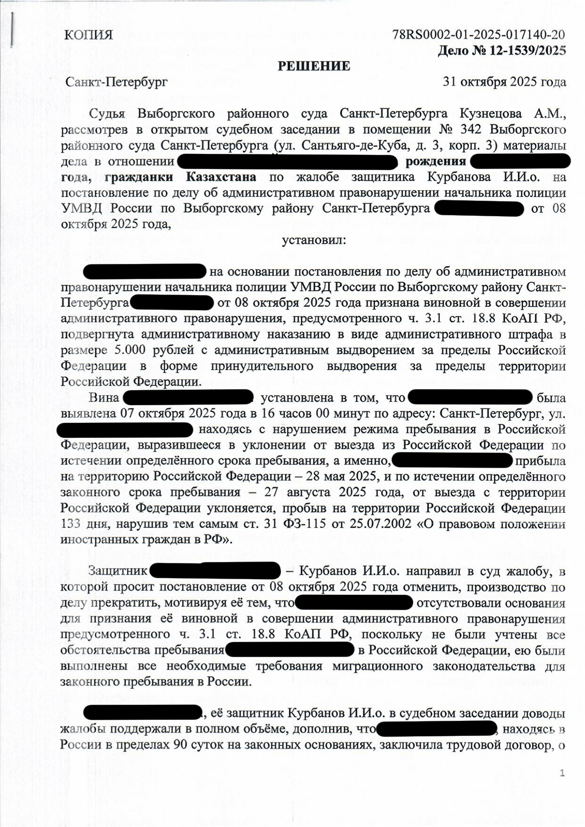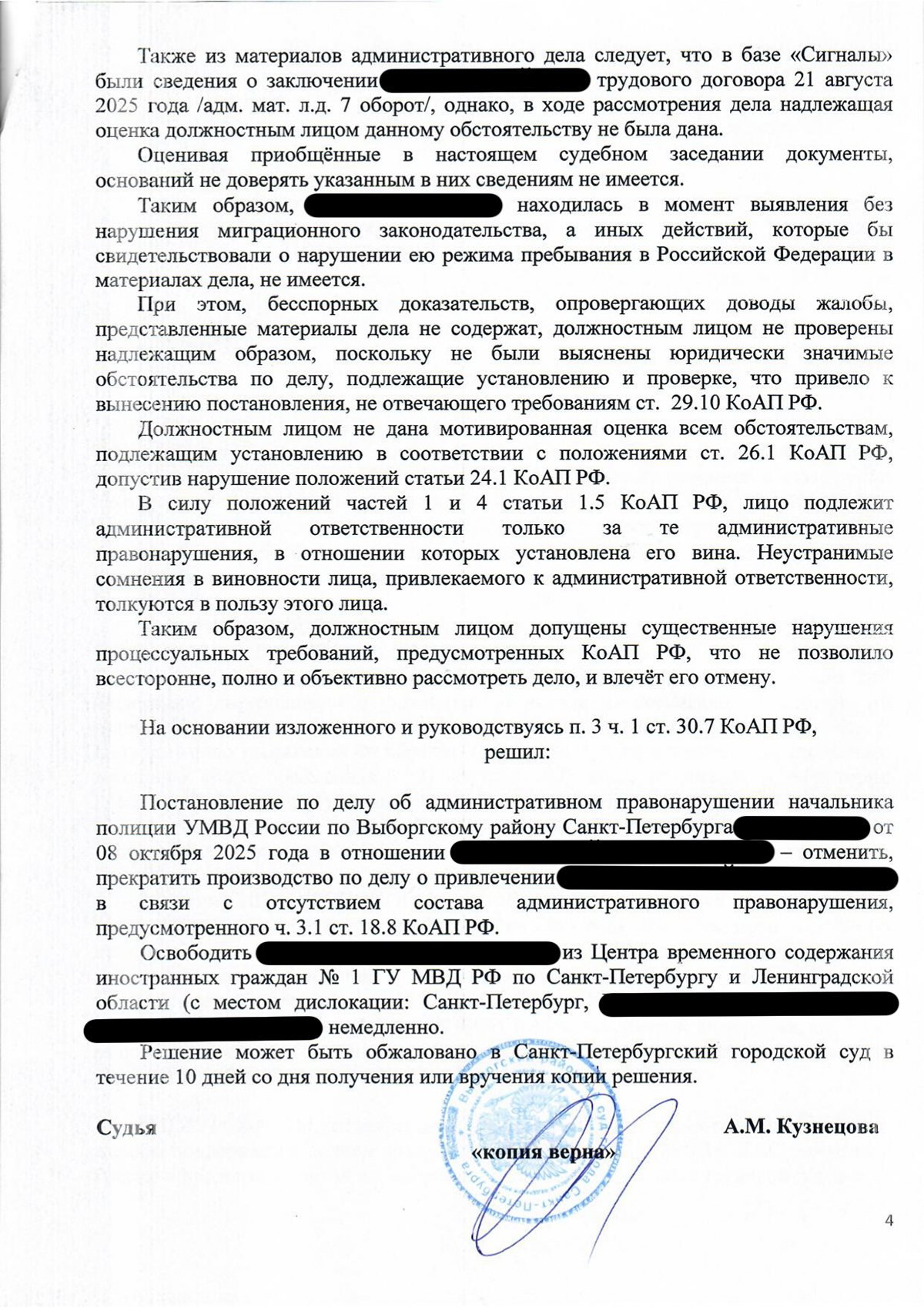 Выборгский районный суд Санкт-Петербурга отменил постановление полиции и прекратил дело — штраф и выдворение признаны незаконными.