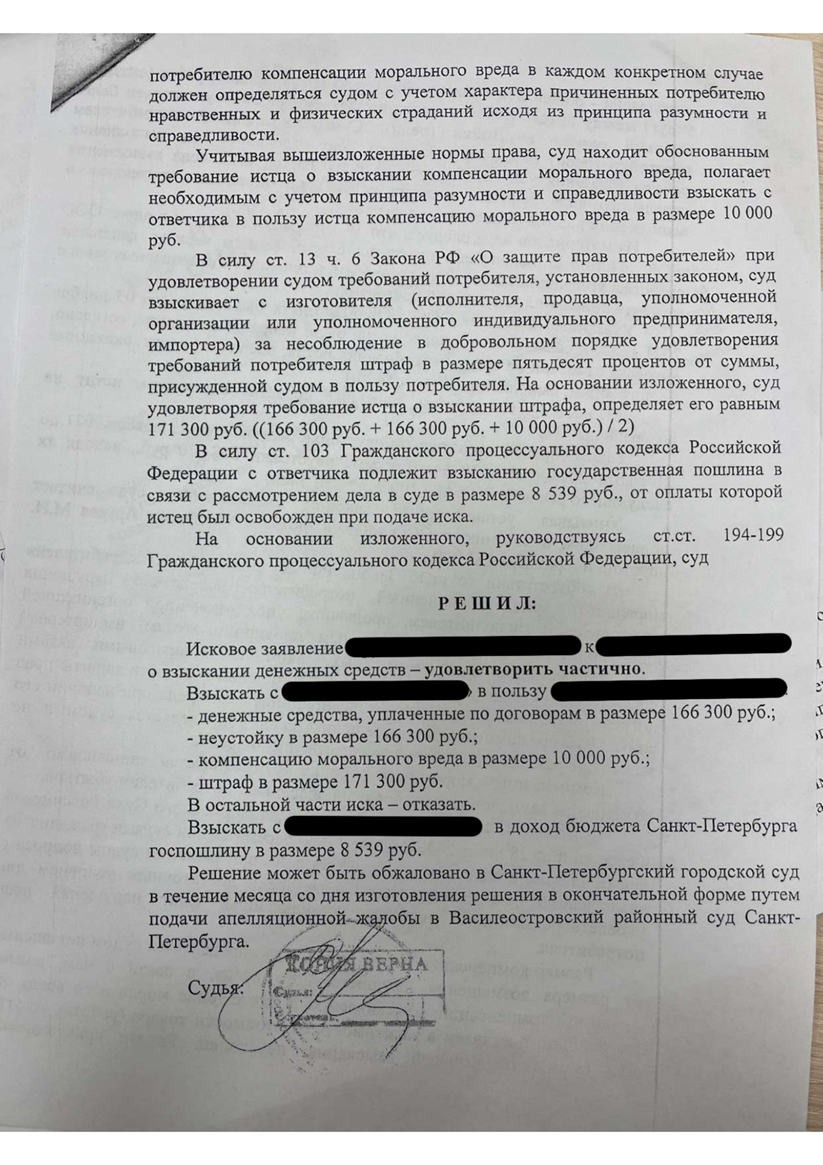 Как результат, Василеостровский районный суд Санкт-Петербурга полностью согласился с нашей позицией в отношении двух договоров и постановил взыскать с другой юридической фирмы в пользу нашего клиента:
