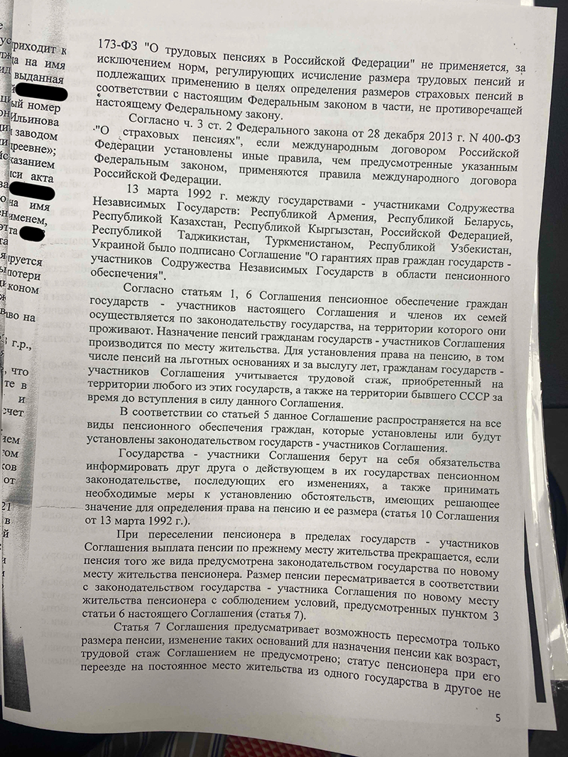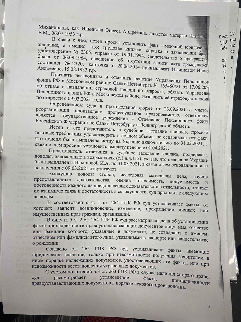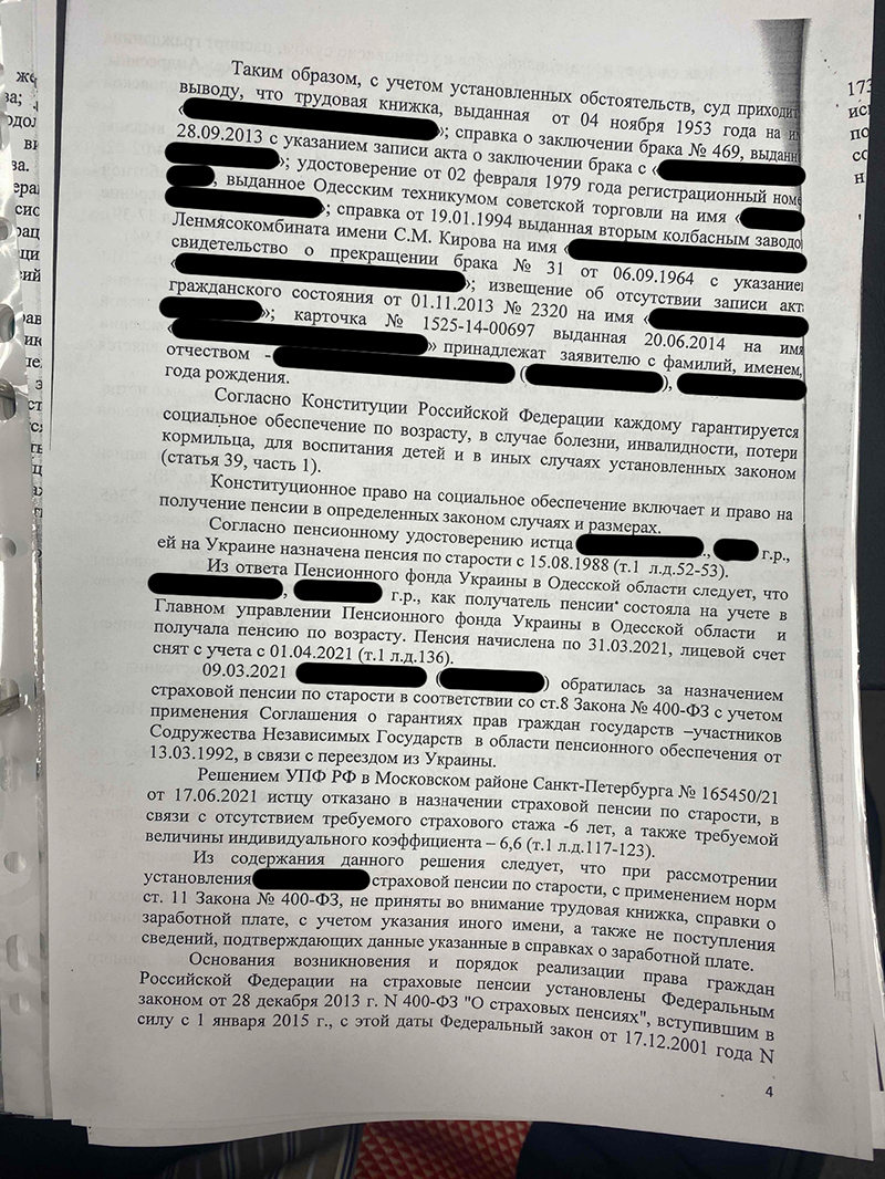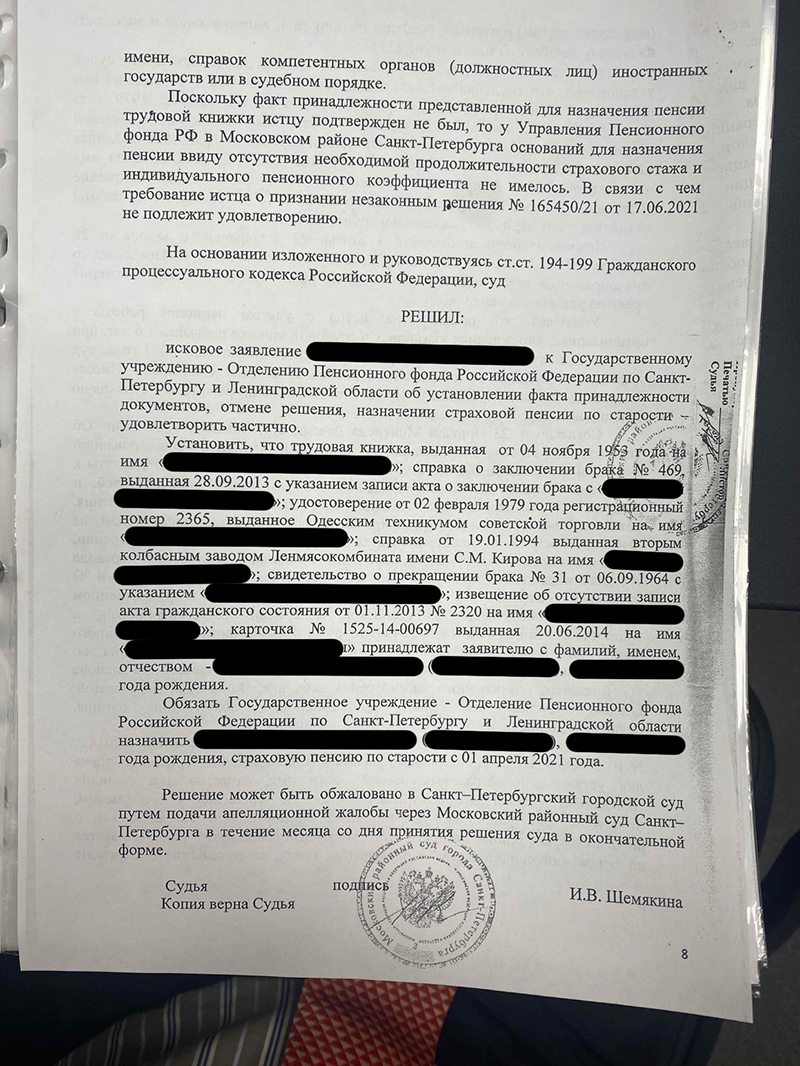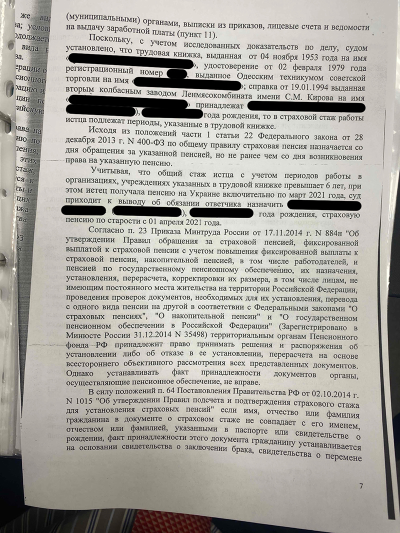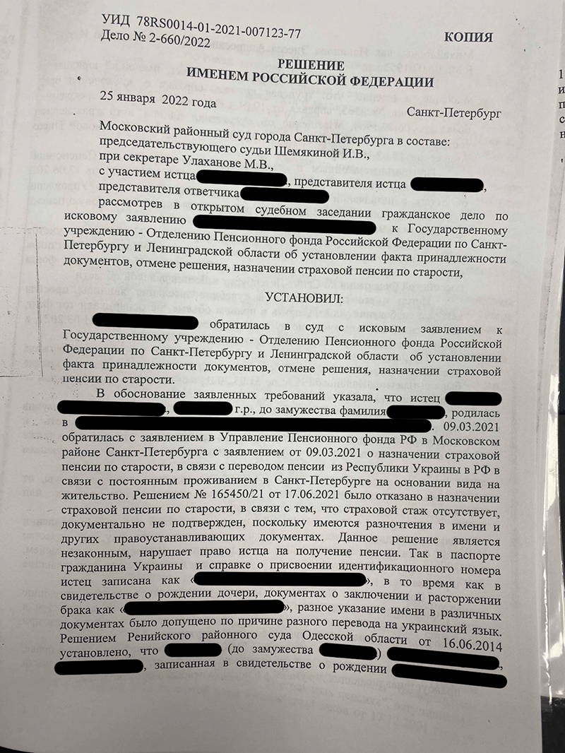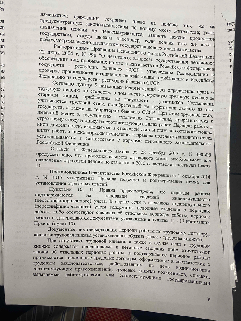 Исследовав доказательства, суд признал спорные документы принадлежащими нашей доверительнице и включил периоды работы в её страховой стаж. Судом установлено, что он превышает минимальные 6 лет, предусмотренные Законом № 400-ФЗ «О страховых пенсиях», поскольку в другом государстве Истец получала пенсию до марта 2021 года, российская пенсия должна быть назначена с 1 апреля 2021 года.