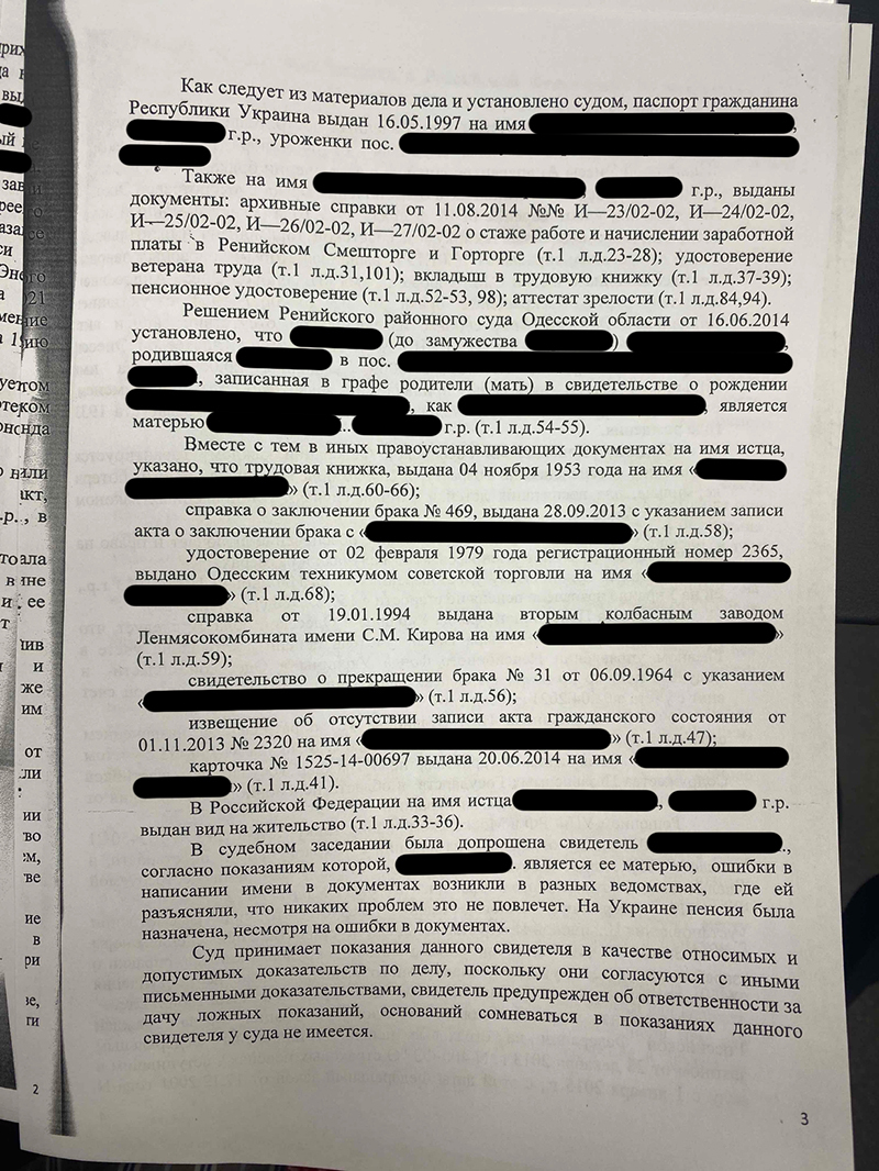 Наши юристы доказали в суде, что ошибки в написании имени возникли из-за особенностей перевода с иностранного языка и встречаются в ряде документов: трудовой книжке, справках, свидетельствах о браке и разводе. Принадлежность документов ей установлено и подтверждено ранее вынесенным решением суда.