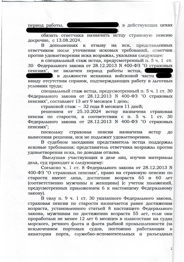В суде юристы настаивали: гражданин работал механиком в воинских частях в начале 90-х, а также более 18 лет в условиях радиационной опасности на атомной станции. Эти периоды, по закону № 400-ФЗ «О страховых пенсиях», дают право на досрочное назначение пенсии.