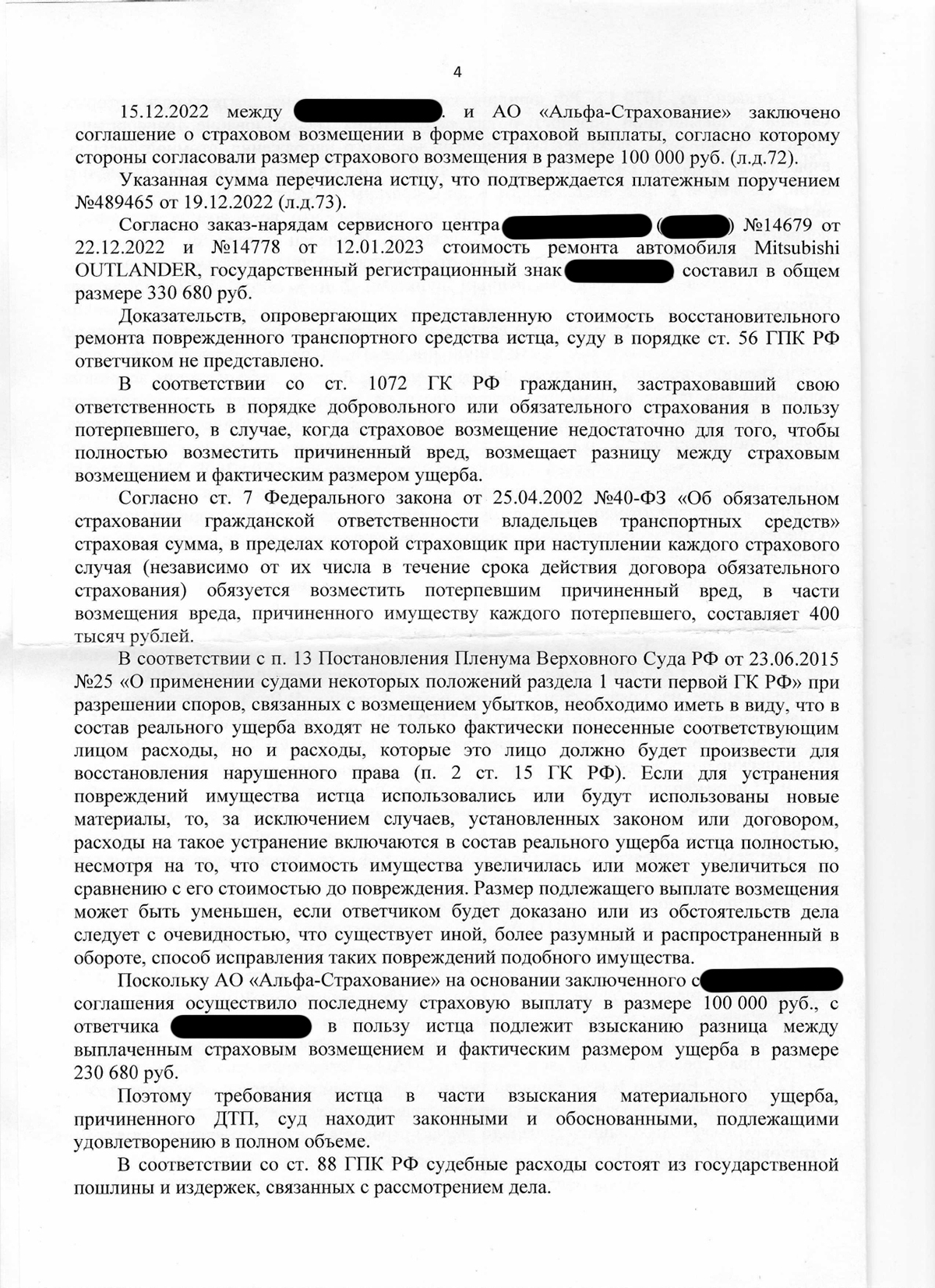 В итоге суд взыскал с ответчика 230 680 рублей в счет возмещения материального ущерба, а также взыскал с ответчика расходы на юридическую помощь и судебные расходы по оплате государственной пошлины.