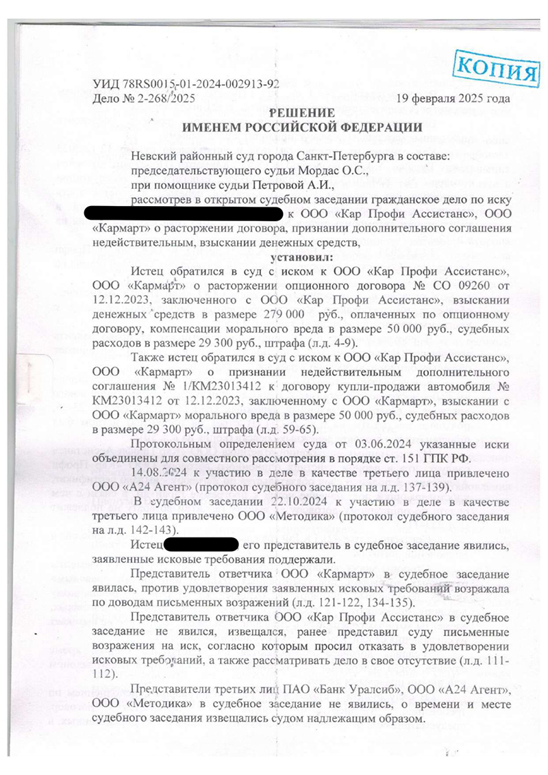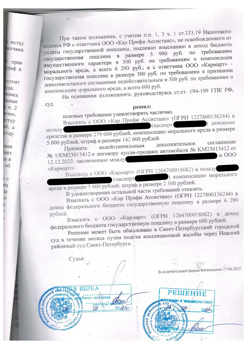 Сложный процесс против двух юридических лиц, навязавших потребителю кредит, страховку и бесполезную гарантию. Суд не только расторг все договоры и вернул деньги, но и взыскал значительную компенсацию, признав саму схему работы автосалона незаконной.