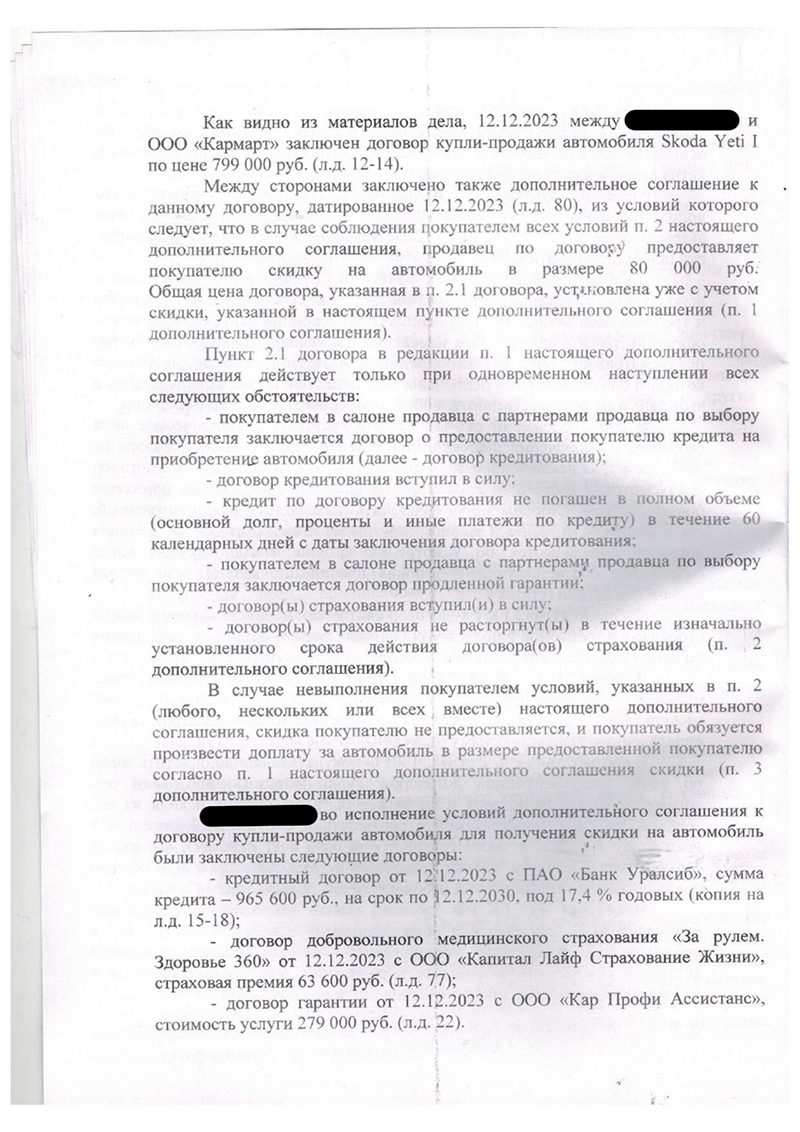 Все эти договоры были взаимосвязаны и оформлены в один день. Фактически, «скидка» в 80 тысяч рублей обернулась для нашего клиента дополнительными расходами на сотни тысяч рублей в виде процентов по кредиту и стоимости навязанных услуг.