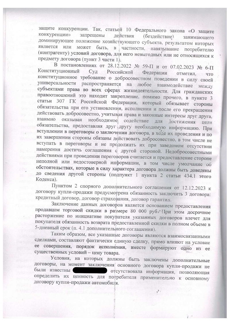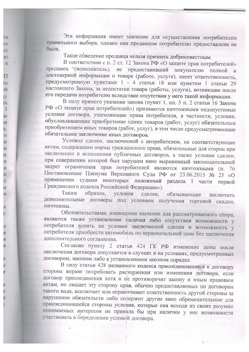 2. Отсутствие добросовестной информации. Продавец не предоставил клиенту полной и достоверной информации о реальной цене автомобиля и о последствиях отказа от дополнительных услуг. Это нарушает ст. 10 Закона «О защите прав потребителей».
