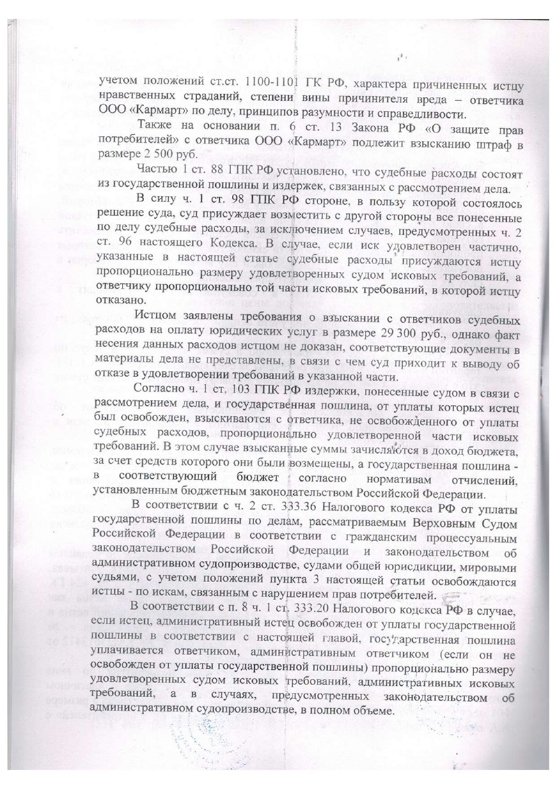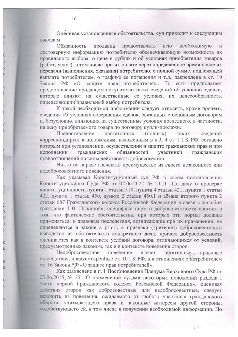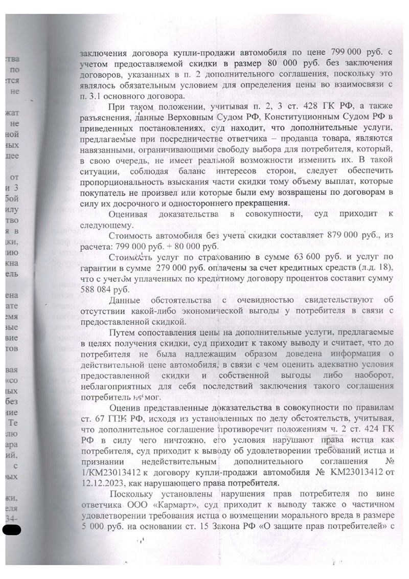 3. Мы апеллировали позицией Верховного и Конституционного Суда. В своих решениях высшие суды неоднократно указывали, что взыскание с покупателя всей суммы «скидки» при отказе от навязанных услуг неправомерно. Возмещению подлежит лишь та часть, которая соответствует неполученному продавцом доходу от партнеров. В данном случае этот доход был ничтожен.