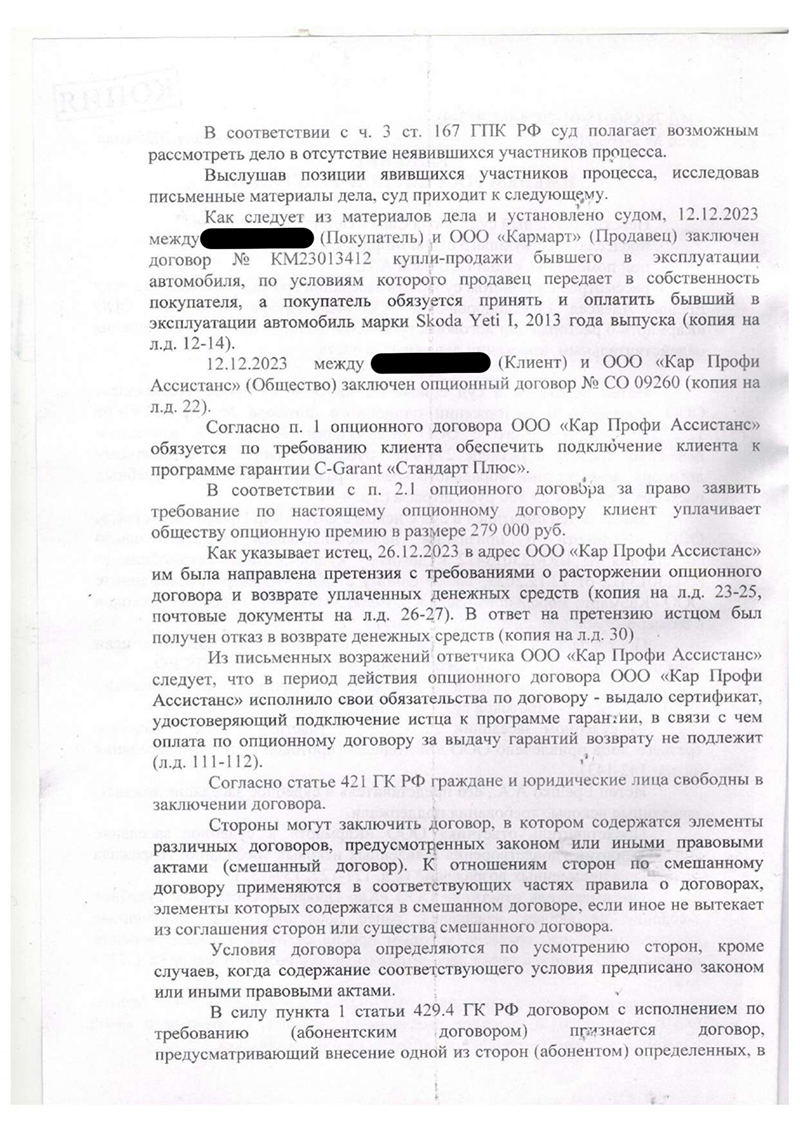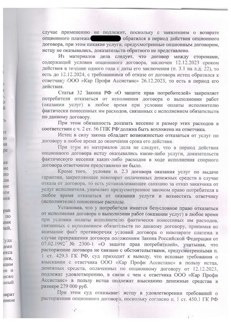 3. Приобрести «гарантию» на автомобиль у ООО «Кар Профи Ассистанс» за 279 000 рублей.