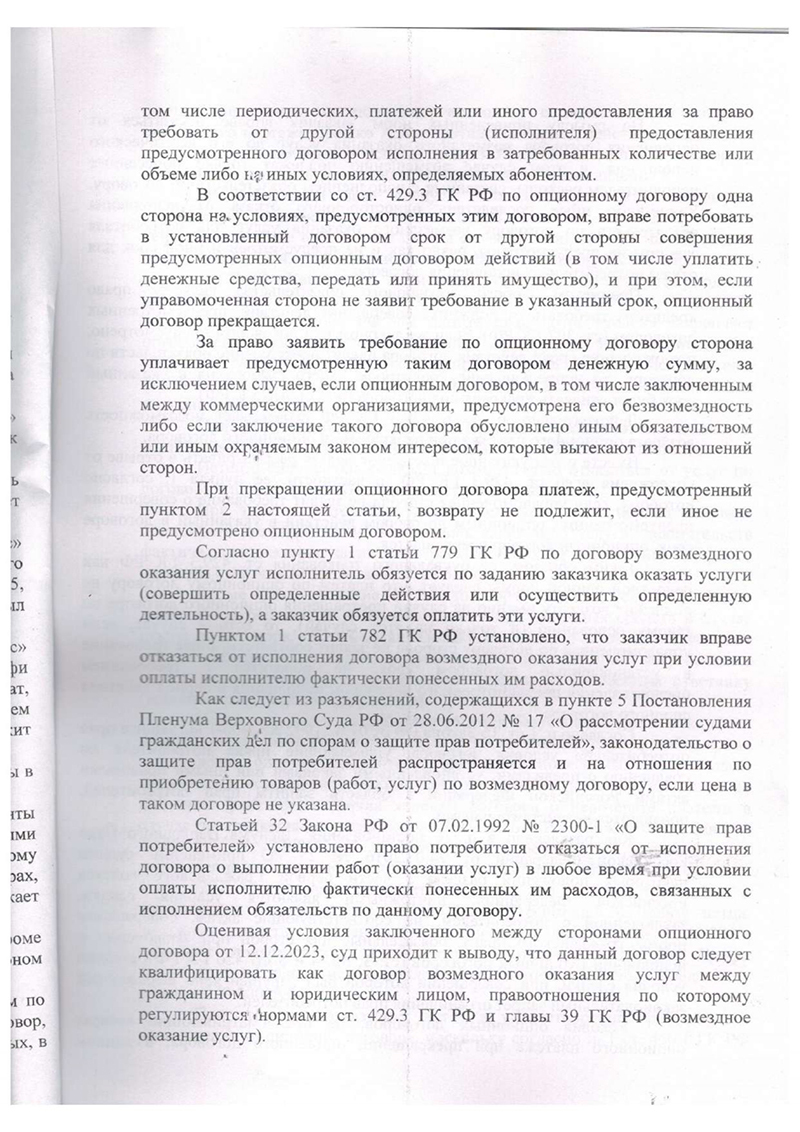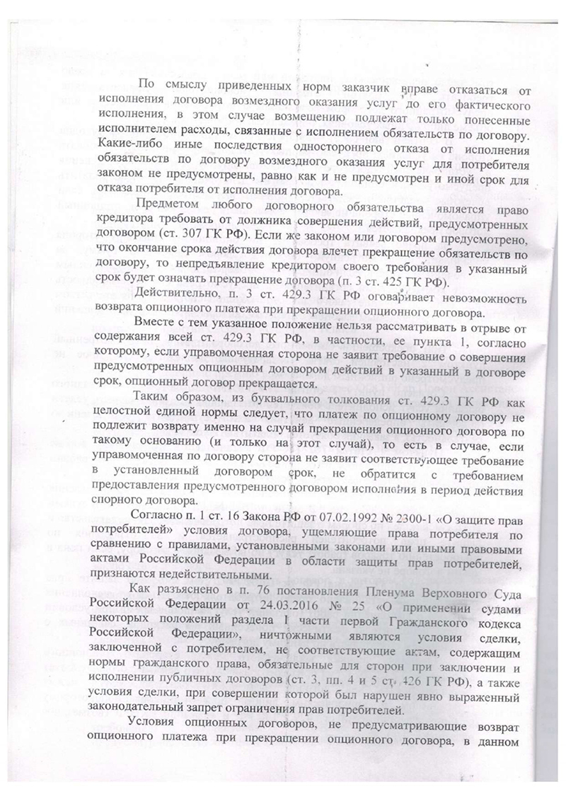 1. Мы квалифицировали «опционный договор» на гарантию как договор возмездного оказания услуг. Это позволило применить ст. 32 Закона «О защите прав потребителей», которая дает право потребителю отказаться от услуги в любой момент, оплатив лишь фактические расходы исполнителя. Так как никакие услуги по «гарантии» оказаны не были, а ее стоимость была завышена в разы, мы потребовали вернуть полную сумму.