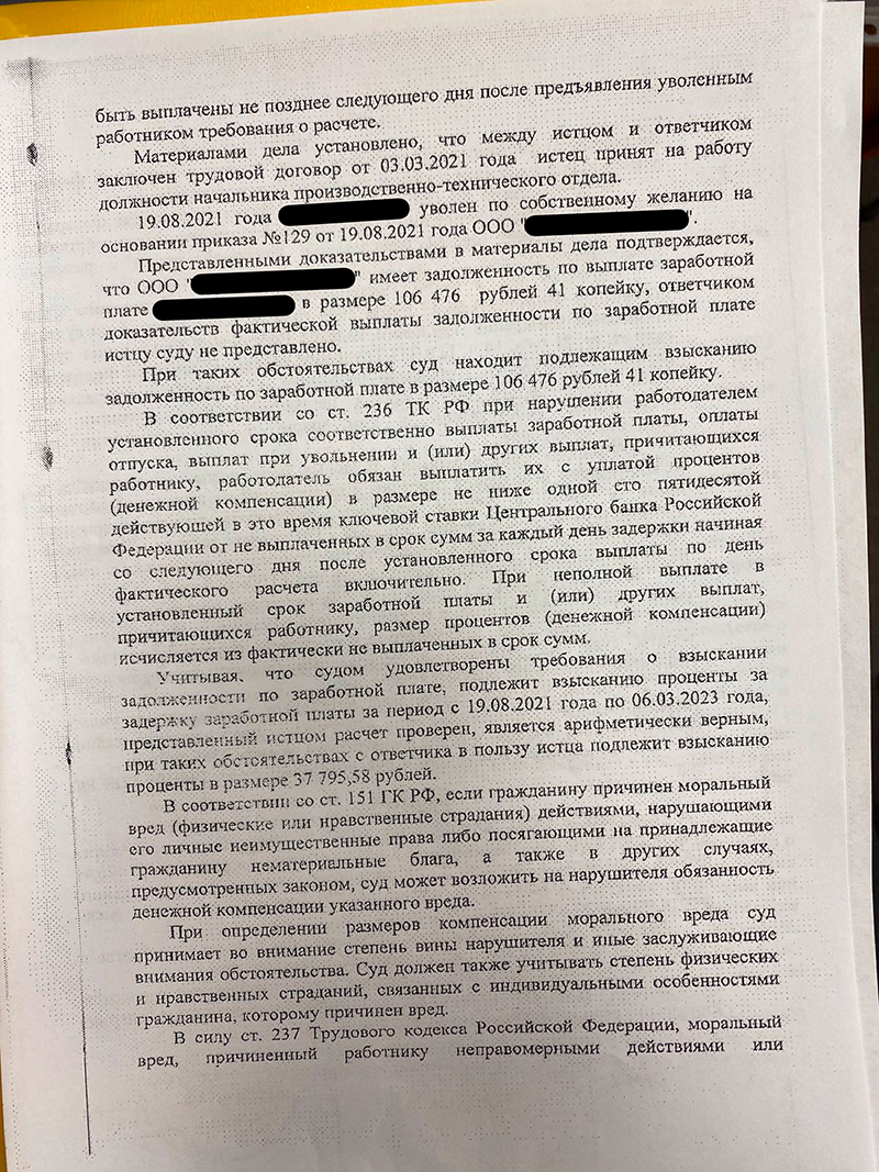 Мы обратились в суд с требованием выплатить долг по зарплате — более 106 тысяч рублей, проценты за просрочку и компенсацию морального вреда.