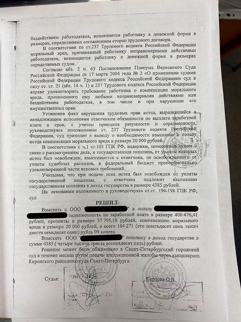 Суд принял наши доводы и возражения относительно документов ответчика и подтвердил: долг по зарплате есть, проценты за задержку насчитаны — почти 38 тысяч рублей. Компенсация морального вреда назначена в размере 20 тысяч рублей — за стресс, вызванный нарушением прав работника.
